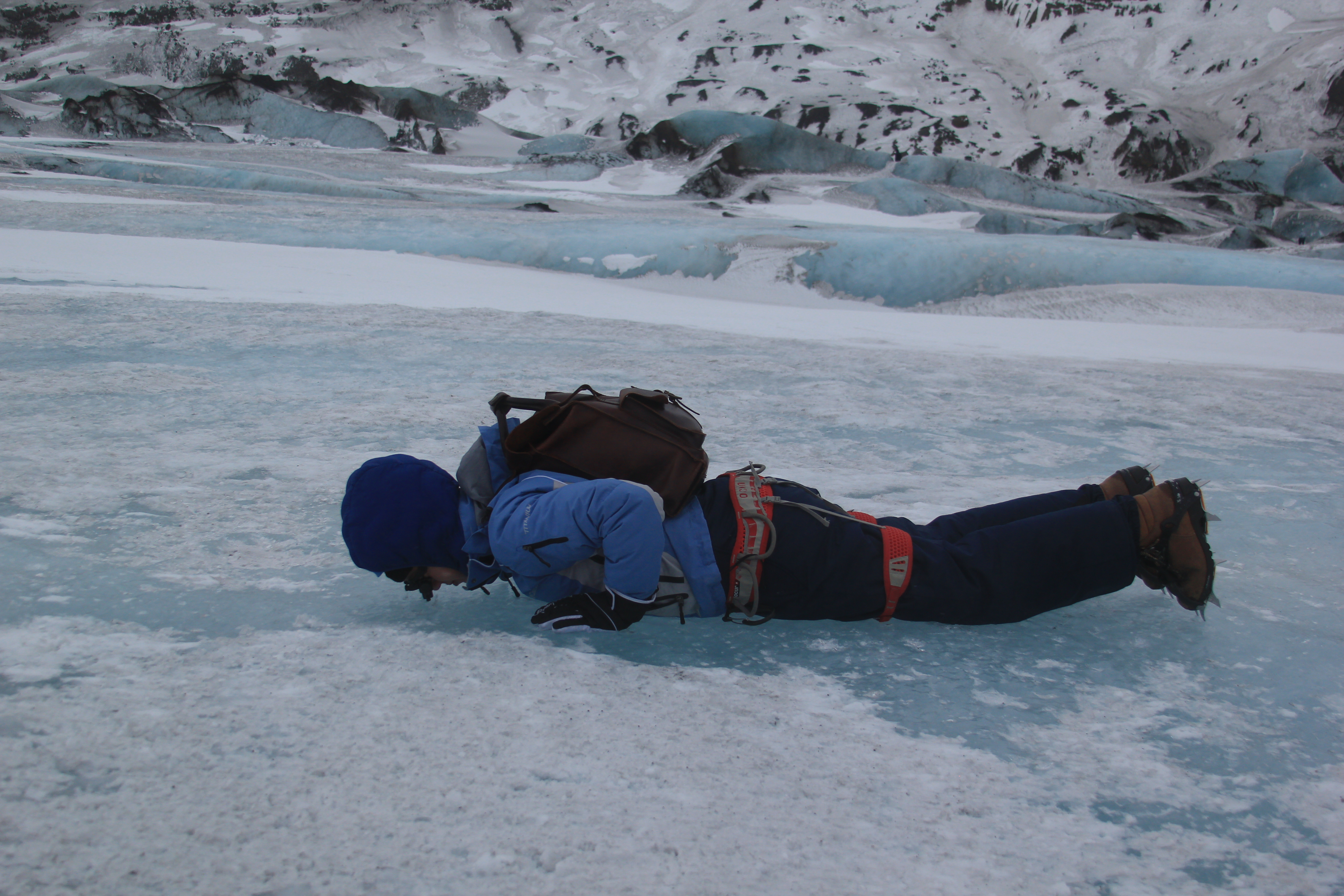 At the glacier of Sólheima one can witness the ashes of 1918 Katla’s eruption emerging from the melting ice. If glued to the icy ground the human might see some of these particles embedded within the ice, waiting to become surface.